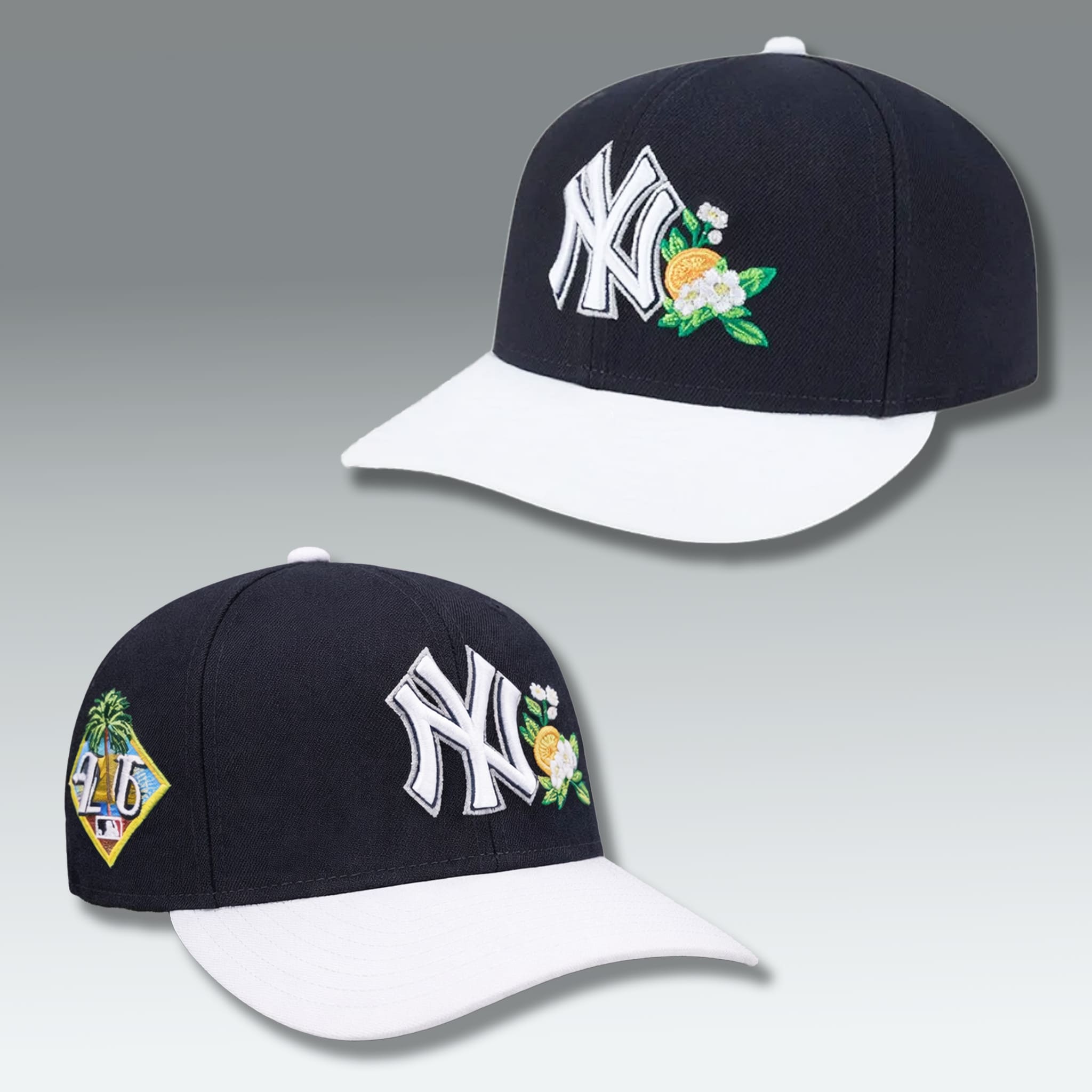 This hat design is a perfect blend of classic and modern, featuring the timeless black Yankees color – symbolizing pride and legendary history. The bold standout detail is the clean white visor, creating a strong contrast that brightens the face and makes the hat instantly eye-catching. Thick embroidered floral and fruit graphics add a vibrant, energetic, and refreshing feel.