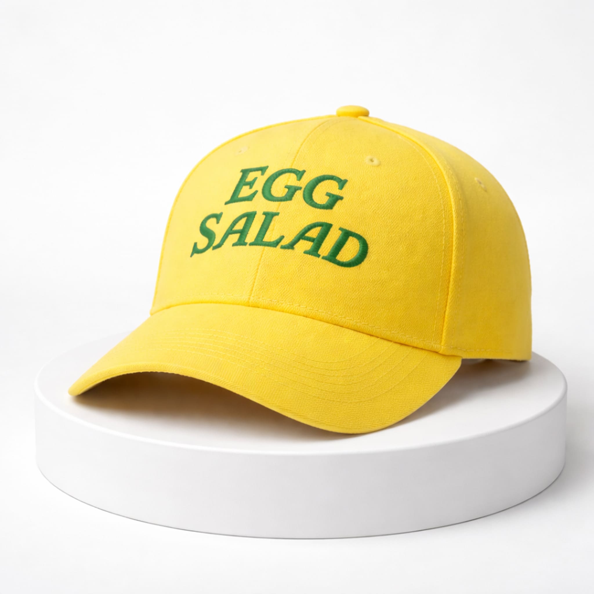 The egg salad sandwich is a simple yet iconic part of Masters tradition: white bread filled with creamy, chilled egg salad – a favorite enjoyed by thousands of spectators every year. The yellow “Egg Salad” hat was created as a humorous and playful tribute to this classic dish, turning everyday food into a fun golf fashion statement.