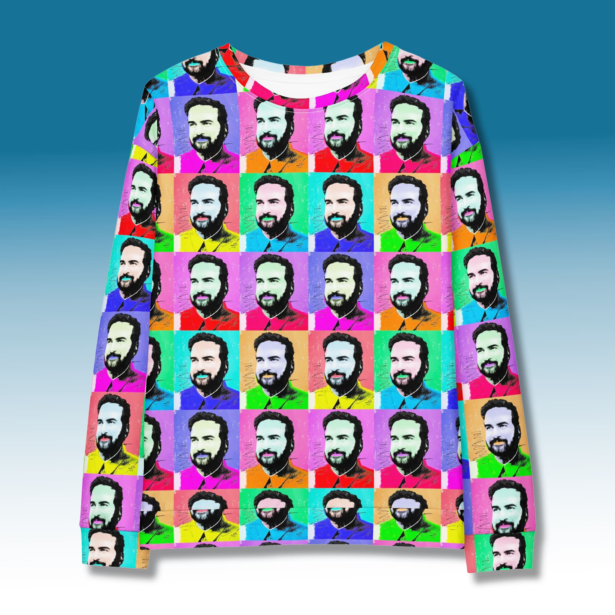 The sweater features a vibrant pop art style, with repeating patterns of Zohran Mamdani’s face in a lively, colorful palette. The overall look showcases a bright, playful design on knitted fabric, creating the perfect festive vibe for any ugly sweater party. The product is available at iFrogtees in multiple sizes for both adults and kids.